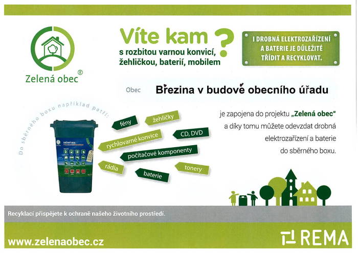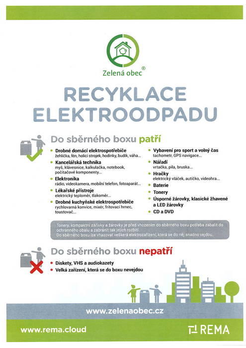 Cílem projektu Zelená obec je ochrana životního prostředí zabezpečením zpětného odběru a efektivní recyklace nepotřebných elektrozařízení.