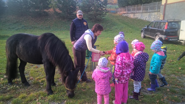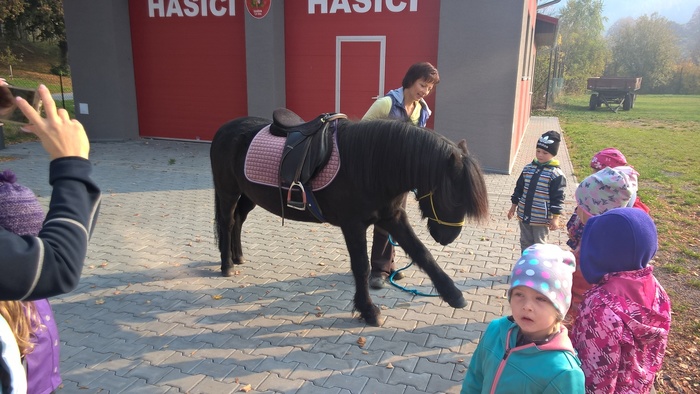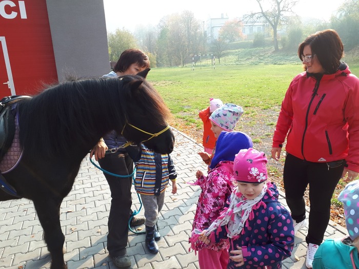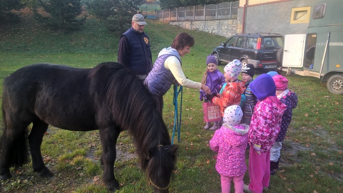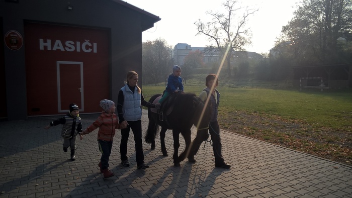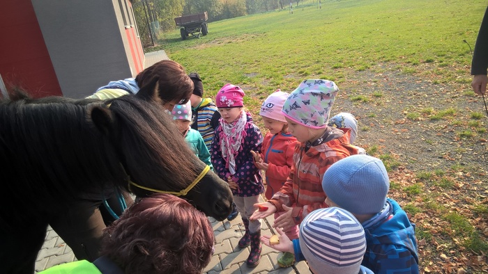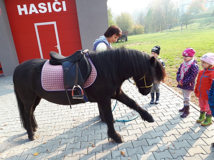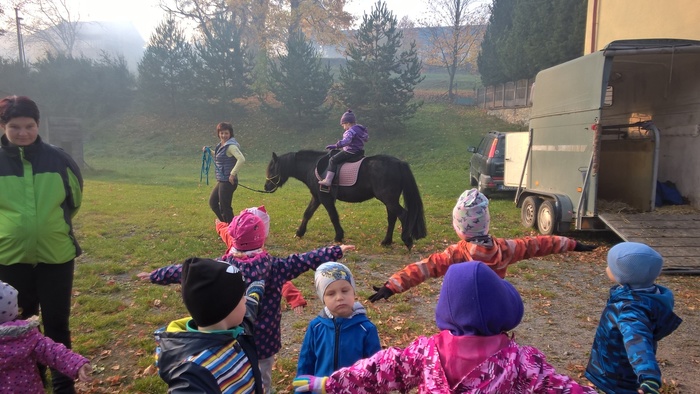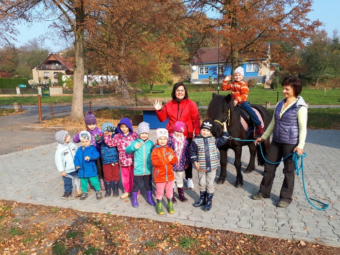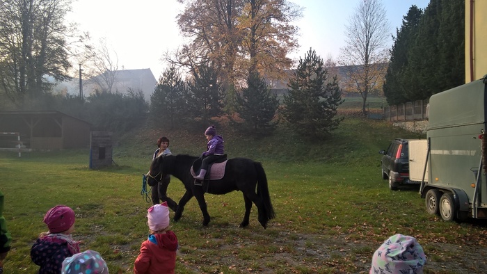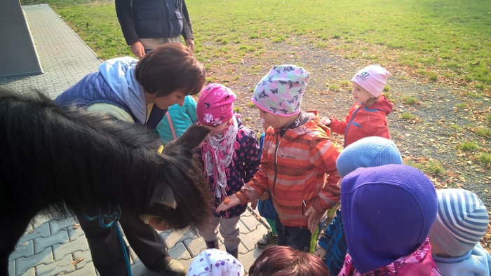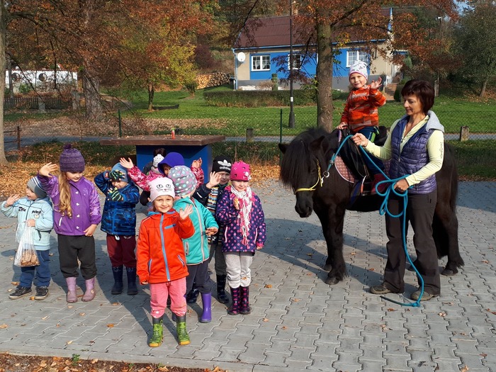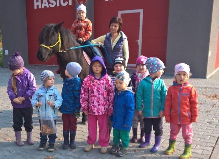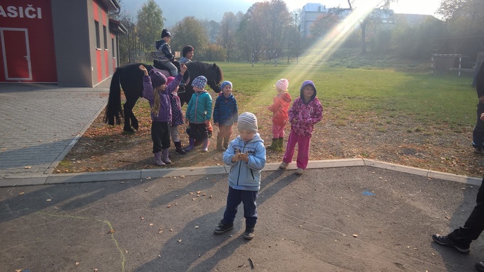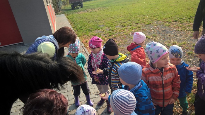 Úvod > Mateřská škola Březina > Fotogalerie MŠ > Netradiční oslava narozenin s koněm Amigem