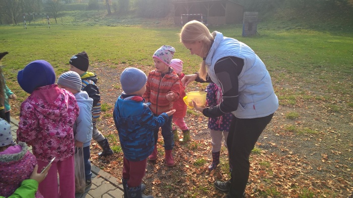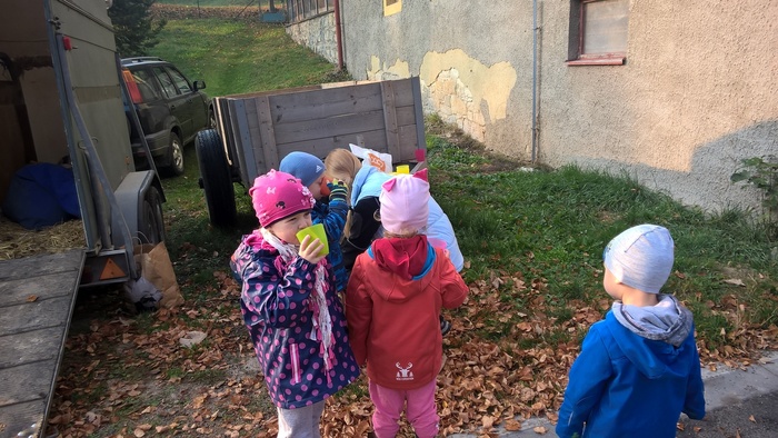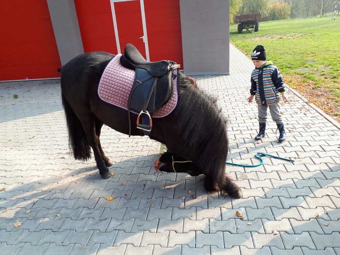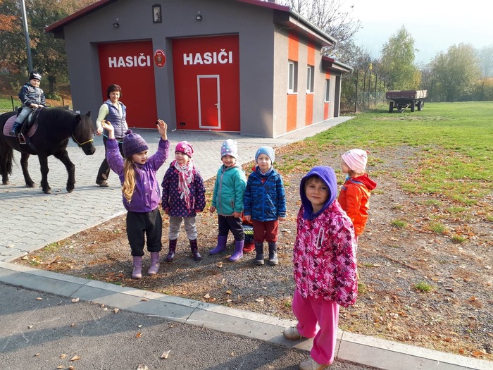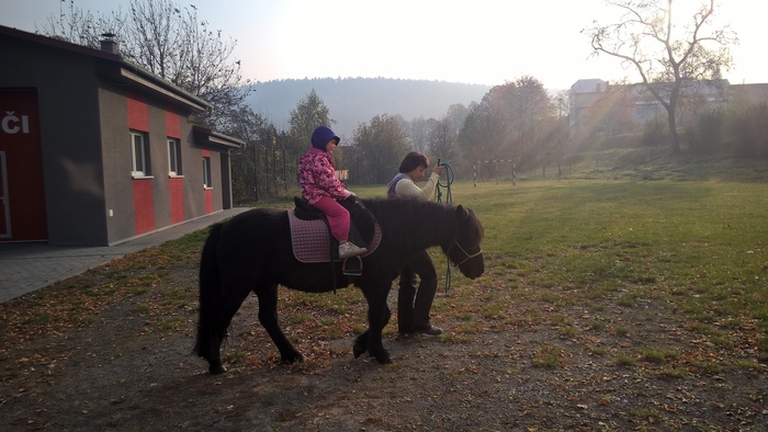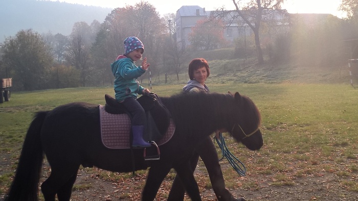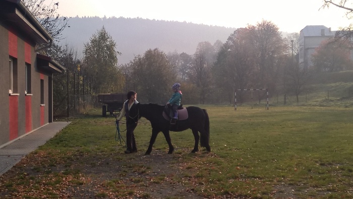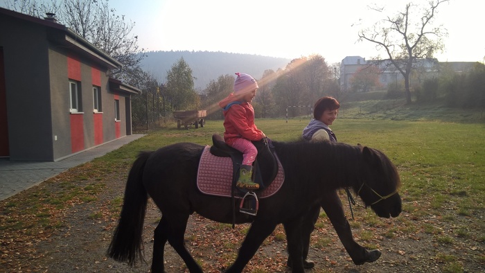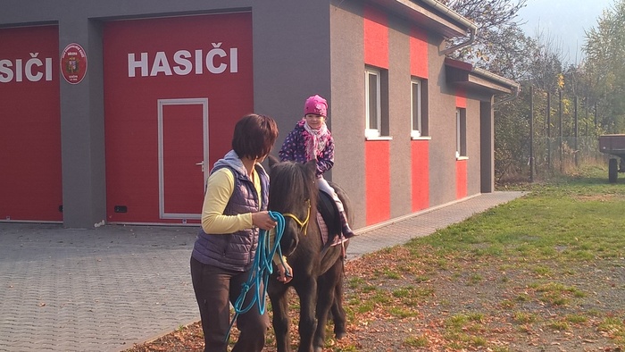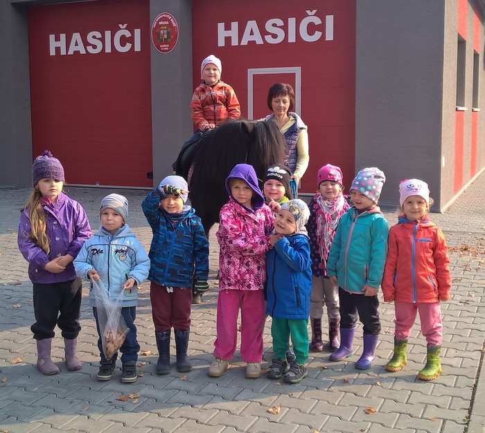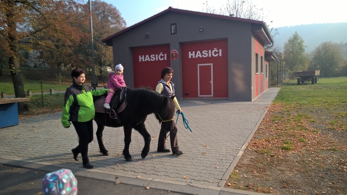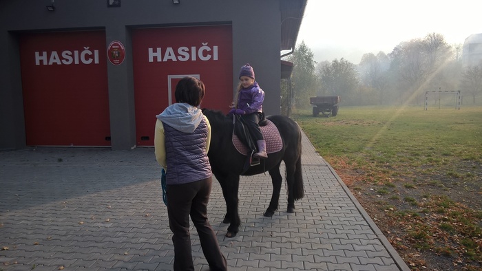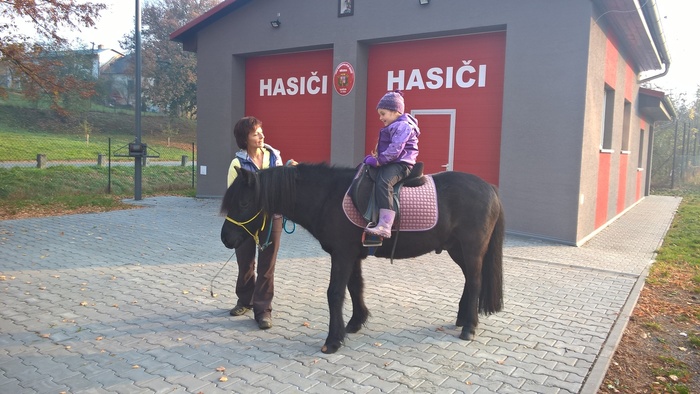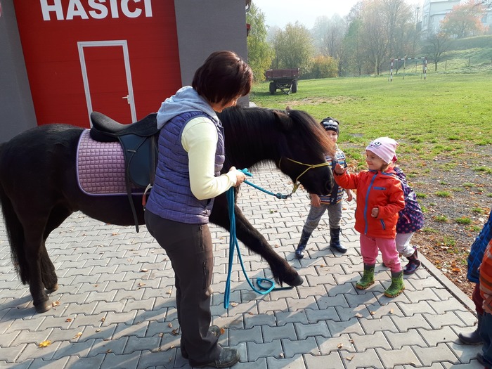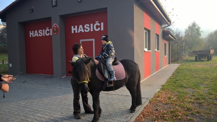 Úvod > Mateřská škola Březina > Fotogalerie MŠ > Netradiční oslava narozenin s koněm Amigem